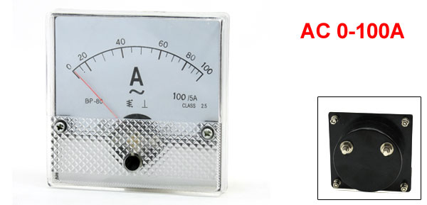 Product Name Analog Ammeter Model BP-80 Measuring Current Range AC 0-100A Accuracy Class 2.5 Meter Face Size(Approx) 8.1 x 8.1 x 1.4cm / 3.1" x 3.1" x 0.43"(L*W*T) Thread Dia. 5mm/ 0.2", 3mm/ 0.12" Overall Depth 5.1cm / 2" Main Color White, Black Weight 104g Package Content 1 x Analog Ammeter