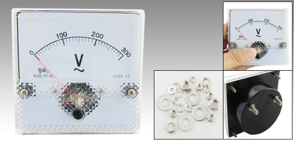 Product Name Analog Voltmeter Measuring Voltage Range AC 0-300V Accuracy Class 2.5 Meter Face Size(Approx) 8 x 8 x 1.3cm / 3.1" x 3.1" x 0.5"(L*W*T) Thread Size 0.48 x 1.3cm / 0.19" x 0.5"(D*L) 0.3 x 0.9cm / 0.11" x 0.35"(D*L) Overall Depth 3.5cm / 1.37" Color White, Black Net Weight 107g Package Content 1 x Analog Voltmeter Several Installing Parts - Reviews