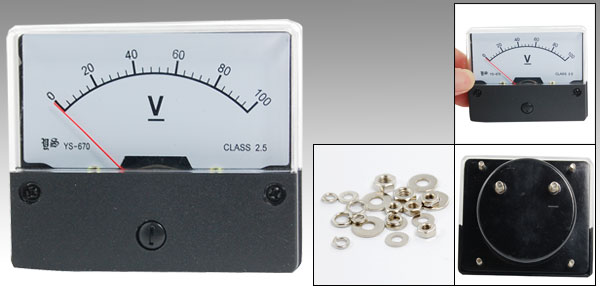 Product Name Analog Voltmeter Model YS-670 Measuring Voltage Range DC 0-100V Accuracy Class 2.5 Meter Face Size(Approx) 7 x 5.8 x 1.2cm/ 2.7" x 2.3" x 0.5"(L*W*T) Thread Size 0.4 x 1cm / 0.15" x 0.4"(D*L) 0.3 x 0.9cm/ 0.11" x 0.35"(D*L) Overall Depth 3.5cm/ 1.4" Color Black, White Net Weight 72g Package Content 1 x Analog Voltmeter Several Installing Parts - Reviews
