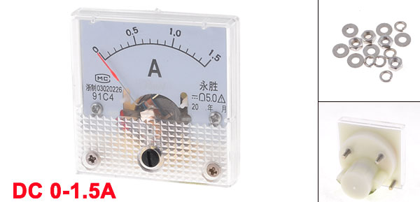 Product Name Analog Ammeter Model No. 91C4 Measuring Current Range DC 0-1.5A Accuracy Class 2.5 Meter Face Size(Approx.) 45 x 45 x 8mm/ 1.77" x 1.77" x 0.3" (L*W*T) Thread Size 0.28 x 0.8cm / 0.11" x 0.30"(Dia.*L) Overall Depth 3.5cm / 1.38" Material Plastic, Electronic Components Color White Net Weight 59g Package Content 1 x Analog Ammeter Several Installing Parts - Reviews