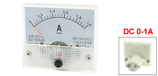 Product Name Analog Ammeter Model No. 85C1-A Measuring Current Range DC 0-1A Accuracy Class 2.5 Meter Front Size(Approx.) 64 x 55 x 11mm / 2.5" x 2.2" x 0.43"(L*W*T) Thread Dia 3mm/ 0.12" Overall Depth 55mm / 2.2" Material Plastic, Electronic Components Color White, Off White Weight 75g Package Content 1 x Analog Ammeter