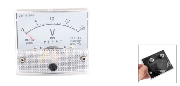 Product Name DC Voltage Panel Meter Scale Range DC 0-20V Accuracy Class 2.5 Material Plastic Color White, Clear, Black Back Screw Dia. 3.8 mm / 0.15" & 2.8 mm / 0.11" Panel Size 6.3 x 5.5 x 1.1 cm / 2.5" x 2.2" x 0.4" (L*W*T) Overall Depth 4.3 cm / 1.69" Weight 62g Package Content 1 x DC Voltage Panel Meter - Reviews
