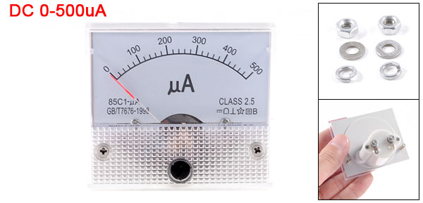 Product Name Analog Ammeter Model 85C1-uA Measuring Range DC 0-500uA Accuracy Class 2.5 Meter Face Size(Approx) 6.4 x 5.6 x 1.1cm / 2.5" x 2.2" x 0.43"(L*W*T) Thread Size 0.28 x 0.75cm / 0.11" x 0.30" (D*L)