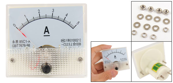 Product Name Analog Ammeter Model No. 85C1-A Measuring Current Range DC 0-5A Accuracy Class 2.5 Meter Face Size(Approx.) 6.3 x 5.5 x 1cm / 2.5" x 2.2" x 0.39"(L*W*T) Thread Size 0.28 x 0.75cm / 0.11" x 0.30"(Dia.*L) 0.28 x 1cm / 0.11" x 0.4"(Dia.*L) Overall Depth 5.6cm / 2.2" Material Plastic, Electronic Components Color White Net Weight 59g Package Content 1 x Analog Ammeter Several Installing Parts - Reviews
