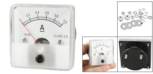 DC Current Panel Meter Model No. YS-50 Scale Range DC 0~1A Accuracy Class 2.5 Back Screw Diameter 4mm/ 0.16" & 3mm/ 0.12" Back Round Base Dia. 45mm/ 1 3/4" Panel Size 5 x 5 x 1.1cm/ 2" x 2" x 0.4" (L*W*T) Overall Depth 4.3cm/ 1.7" Color White & Black Main Material Plastic & Metal Net Weight 58g Package 1 x DC Current Panel Meter - Reviews