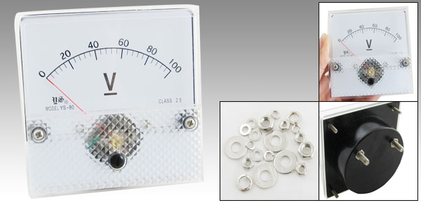 DetailsClass 2.5 Accuracy Voltmeter DC 0-100V Panel Volt Meter  Product Name Analog Voltmeter Measuring Voltage Range DC 0-100V Accuracy Class 2.5 Meter Face Size(Approx) 8 x 8 x 1.3cm / 3.1" x 3.1" x 0.5"(L*W*T) Thread Size 0.48 x 1.3cm / 0.19" x 0.5"(D*L) 0.3 x 0.9cm / 0.11" x 0.35"(D*L) Overall Depth 3.5cm / 1.37" Color White, Black Net Weight 104g Package Content 1 x Analog Voltmeter Several Installing Parts