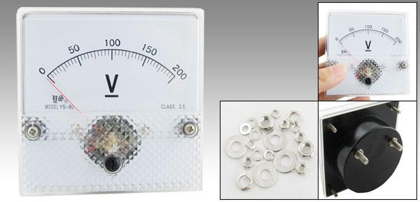 DetailsClass 2.5 Accuracy Voltmeter DC200V Panel Volt Meter  Product Name Analog Voltmeter Measuring Voltage Range DC 0-200V Accuracy Class 2.5 Meter Face Size(Approx) 8 x 8 x 1.3cm / 3.1" x 3.1" x 0.5"(L*W*T) Thread Size 0.48 x 1.3cm / 0.19" x 0.5"(D*L) 0.3 x 0.9cm / 0.11" x 0.35"(D*L) Overall Depth 3.5cm / 1.37" Color White, Black Net Weight 104g Package Content 1 x Analog Voltmeter Several Installing Parts