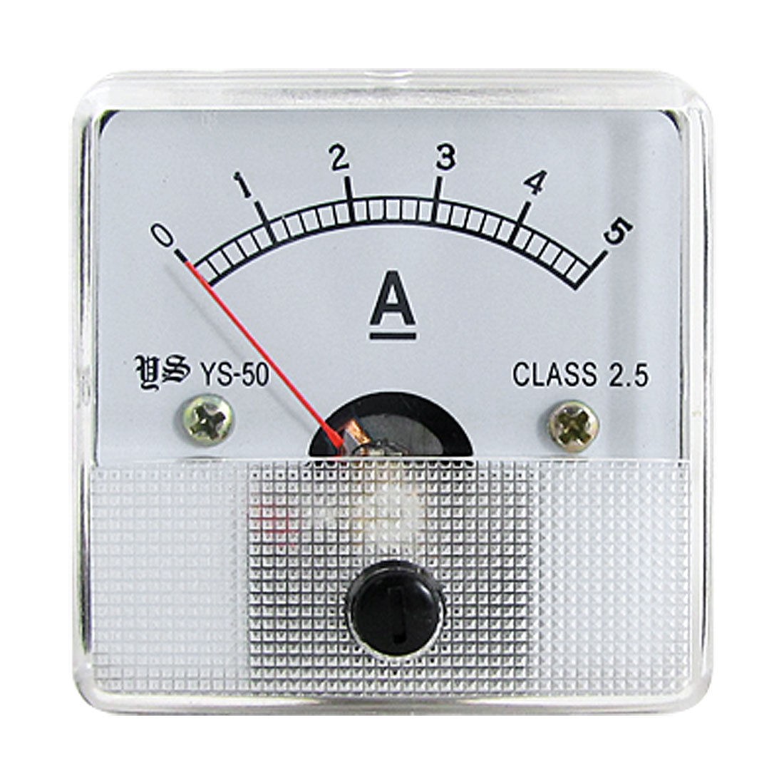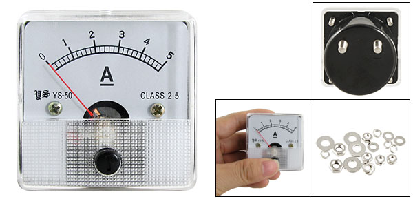 Product Name Analog Ammeter Model YS-50 Measuring Current Range DC 0-5A Accuracy Class 2.5 Meter Face Size(Approx) 5 x 5 x 1cm / 1.9" x 1.9" x 0.39"(L * W * T) Thread Size 0.3 x 0.9mm / 0.11" x 0.35"(D * L) 0.2 x 0.9cm / 0.07" x 0.35"(D * L) Overall Depth 3.3cm / 1.3" Color White, Black Net Weight 58g Package Content 1 x Analog Ammeter Several Installing Parts - Reviews