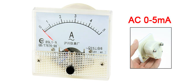 Product Name Analog Ammeter Model 85L1-A Measuring Current Range AC 0-5A Accuracy Class 2.5 Meter Face Size(Approx) 6 x 5.5 x 1.3cm / 2.4" x 2.2" x 0.39"(L*W*T) Thread Size 2.8mm x 0.9mm(D*L)