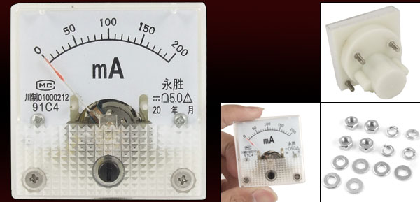 Product Name Analog Ammeter Model 91C4 Accuracy Class 5.0 Measuring Range DC 0-200mA Meter Face Size(Approx) 4.4 x 4.4 x 0.8cm/1.7" x 1.7" x 0.3"(L*W*T) Thread Diameter 2.7mm/0.1" Overall Depth 3.5cm/1.37" Color As Picture Show Net Weight 32g Package Content 1 x Mini Analog Ammeter Installing Parts - Reviews