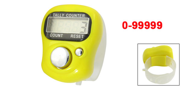 Product Name Finger Counter Material Plastic Count Range 0-99999 Counter Size 3.5 x 2.8 x 1.4cm/1.3'' x 1.1'' x 0.6''(L*W*H) Band Size 10.7 x 1.5cm/4.2" x 0.6"(L*W) Fit Finger Girth Max: 11cm/4.3" (Max) Color Yellow Band Color Clear Net Weight 16g Package Content 1 x Finger Tally Counter - Reviews