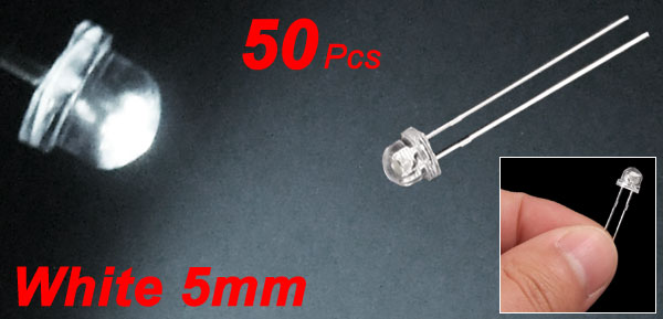Product Name Light Emitting Diode Material Semiconductor Quantity 50±2% Pcs Emitting Light Color White Head Dia. 5mm/ 0.197" Size(Approx) 33 x 3mm / 1.3" x 0.1"(L*W) Forward Voltage 3.2-3.4V Luminous Intensity 1400-1600MCD Main Color Clear, Silver Tone Weight 11g Package Content 50 x Light Emitting Diodes - Reviews
