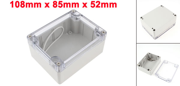 Product Name Junction Box Mounted Type Surface Mounted Mount Hole Dia 4mm Box Size 108mm x 85mm x 52mm/4.3" x 3.3" x 2"(L*W*H) Material Plastic Color Light Gray, Clear Net Weight 150g Package 1 x Junction Box