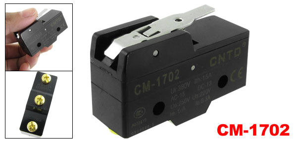 Product Name Micro Switch Model No. CM-1702 Actuator Type Straight Short Hinge Lever Contact Type 1 NO, 1 NC, 1 Com Terminal Type Screw Terminals Ui 380V Ith 15A AC-15 Ue: 250V, le: 6A DC-13 Ue: 220V, le: 0.3A Actuator Size 3.86 x 0.8cm / 1.5" x 0.3"(L*Max W) Hole Dia 0.42cm / 0.165" Overall Size 5 x 1.75 x 2.94cm / 2" x 0.69" x 1.1"(L*W*H) Material Metal, Plastic Color As Picture Show Net Weight 36g Package Content 1 x Micro Switch - Reviews