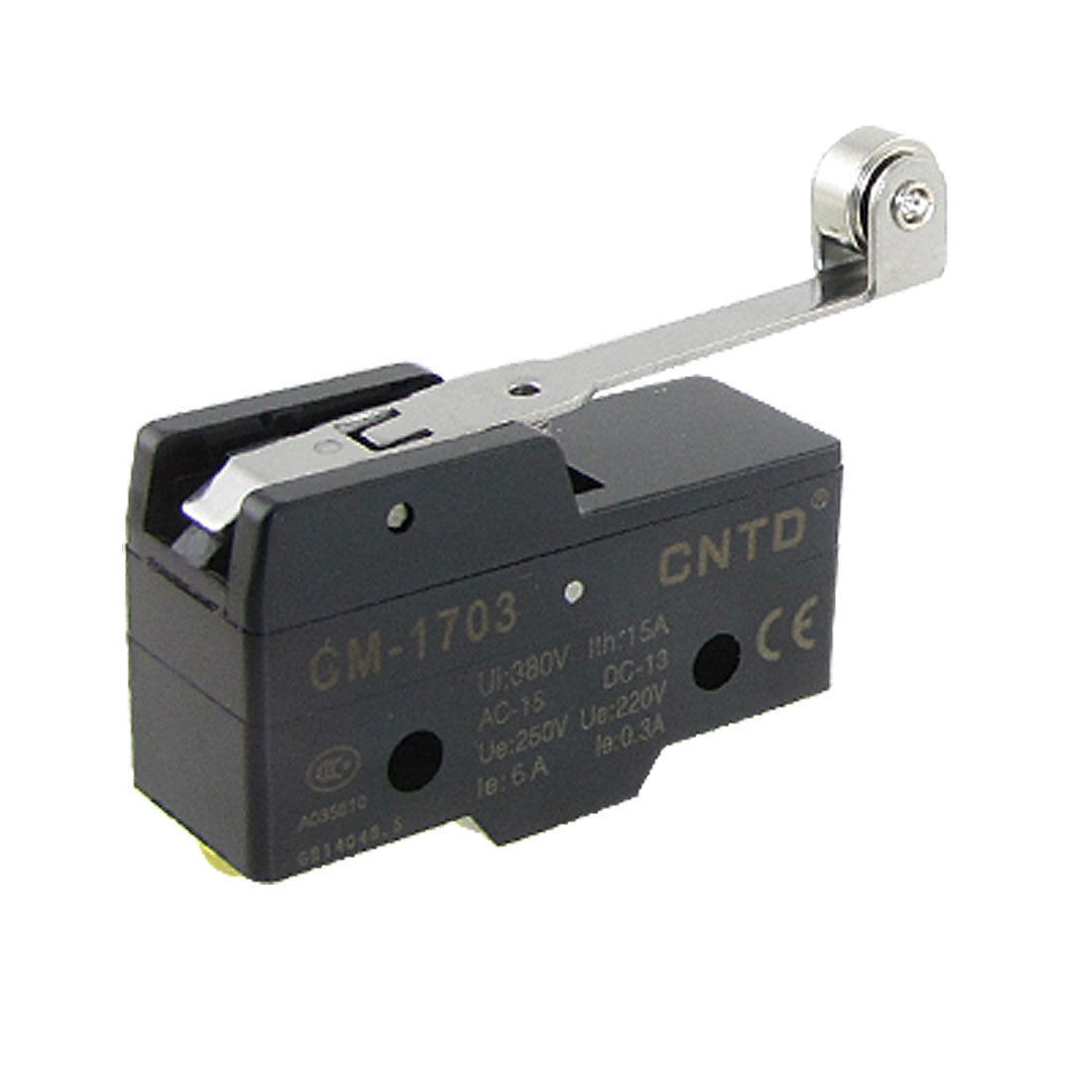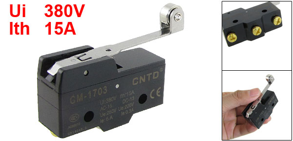 Product Name Micro Switch Model No. CM-1703 Actuator Type Long Hinge Roller Lever Contact Type 1 NO, 1 NC, 1 Com Terminal Type Screw Terminals Ui 380V Ith 15A AC-15 Ue: 250V, le: 6A DC-13 Ue: 220V, le: 0.3A Actuator Size 6.2 x 0.8cm / 2.4" x 0.3"(L*Max W) Roller Size 0.94 x 0.47cm / 0.37" x 0.18"(D*T) Hole Dia 0.42cm / 0.165" Overall Size 5 x 1.75 x 2.94cm / 2" x 0.69" x 1.1"(L*W*H) Material Metal, Plastic Color As Picture Show Net Weight 40g Package Content 1 x Micro Switch - Reviews