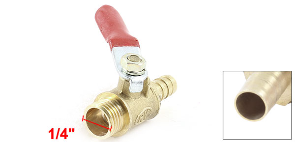 Product Name Gas Ball Valve Material Brass, Plastic Color Brass Tone, Red Size 1/4" x 1/4" Female Thread Diameter 1cm (Inside) Body Overall Size 4.2 x 3cm/ 1.7" x 1.2"(L*D)