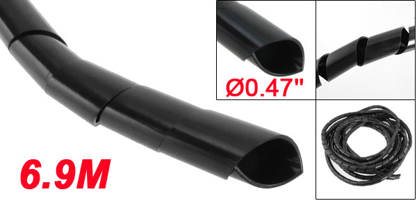 Product Name Spiral Wrap Material Polyethylene Color Black Total Length(Approx.) 6.9M / 22 Ft (271.7'') Outside Diameter 12mm / 0.47'' Thickness 1mm / 0.04'' Net Weight 154g Package Content 1 x Spiral Wrap - Reviews