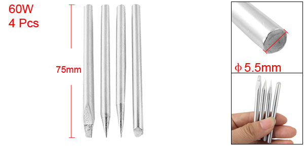 Product Name Soldering Iron Tip Material Metal Design Single Flat, Micro Point, Chisel, Conical Power 60W Total Length(Each) 75mm/3" Shank Diameter 5.5mm Conical Tip Diameter 1mm/3/64" Single Flat Tip Diameter 6mm/15/64" Chisel Tip Width 4mm/5/32" Color Silver Tone Weight 63g Package Content 4 x Soldering Iron Tip - Reviews