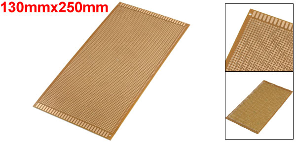 Product Name Universal PCB Board Hole Dia(Approx) 1mm / 0.039" Hole Pitch(Approx) 2.54cm / 0.1" Size(Approx) 130 x 250mm / 5.1" x 9.8"(W*L) Thickness(Approx) 1.1mm / 0.043" Material FR-4 Color Copper Tone Net Weight 60g Package Content 1 Pcs x Universal PCB Board - Reviews