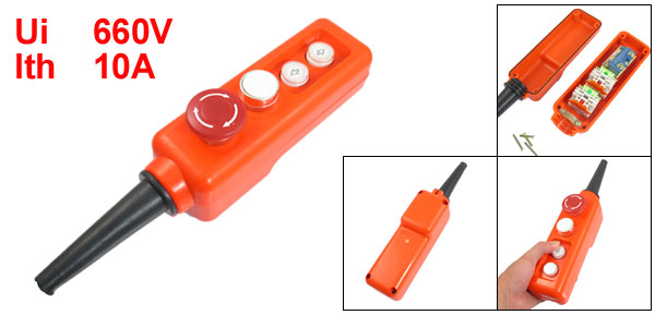 Product Name Hoist Pushbutton Switch Model No. COB COJ2143 Contact Type Momentary Emergency Stop Contact Type Self Locking IEC 337 Ui 660V Ith 10A Push Buttons White Push Button, Emergency Stop(red),Up, Down Main Body Size 20 x 5.8 x 6.5cm / 7.9" x 2.3" x 2.6"(L*W*H) Insulating Tube Length 10.2cm / 4" Fit Cable Diameter 1.1cm / 0.43" External Material Plastic, Rubber Color Orange Red, Black Net Weight 347g Package Content 1 x Hoist Pushbutton Switch - Reviews