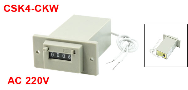 Product Name Electromagnetic Counter Model CSK4-CKW Input Power AC 220V 50/60Hz Digits 4 Wire Length 18cm/7.1" Panel Size 60 x 31mm/2.4" x 1.2"(L*W) Mounted Size 37 x 26 x 62mm / 1.5" x 1"x 2.4"(L*W*T) Total Length 73mm/2.9" Fixing Hole Diameter 3.5mm/0.1" Fixing Hole Center Distance 49mm/1.9" External Material Plastic Color Gray Net Weight 108g Package Content 1 x Eectromagnetic Counter - Reviews