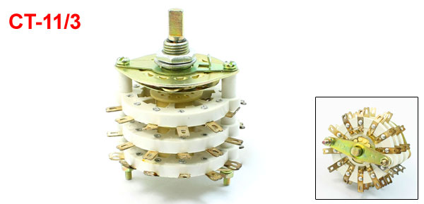 Product Name Rotary Switch Model CT-11/3 Material Metal, Ceramics, Plastic Dimensions 5.5 x 7.5cm / 2.2" x 3"(Max.D*H) Fit Mounting Hole Diameter 10mm / 0.39" Pin Number 3*12 Contact Type 3 Pole 11 Position, 3 Deck Net Weight 87g Package Content 1 x Rotary Switch - Reviews