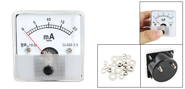 Product Name Analog Ammeter Model YS-50 Measuring Current Range DC 0-20mA Accuracy Class 2.5 Meter Face Size(Approx) 5 x 5 x 1cm / 1.9" x 1.9" x 0.39"(L * W * T) Thread Size 0.3 x 0.9mm / 0.11" x 0.35"(D * L) 0.2 x 0.9cm / 0.07" x 0.35"(D * L) Overall Depth 3.3cm / 1.3" Color White, Black Net Weight 58g Package Content 1 x Analog Ammeter Several Installing Parts - Reviews