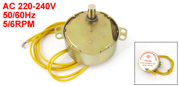Product Name Fan Synchronous Motor Model TYJ50 Direction CW/CCW Voltage AC 220-240V Frequency 50/60Hz Max Power <=4W Speed 5/6RPM Body Size 63 x 21mm/ 2.5" x 0.8"(D*H) Shaft Size 7 x 22mm/ 0.28" x 0.9"(D*L) Thread Hole Diameter 3mm/ 0.12" Mount Hole Diameter 4mm/ 0.16" Cable Length 51cm/ 20" Main Material Metal Color Bronze Tone, Yellow Net Weight 83g Package Content 1 x Fan Synchronous Motor - Reviews