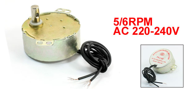Product Name Fan Synchronous Motor Model TYJ50 Direction CW/CCW Voltage AC 220-240V Frequency 50/60Hz Speed 5/6RPM Power 4W Body Size 49 x 21mm/ 1.9" x 0.83"(D*H) Shaft Size 7 x 14mm/ 0.28" x 0.55"(D*L) Mount Hole Diameter 4.5mm/ 0.18" Cable Length(Each) 40cm/ 15.7" Main Material Metal Color As Picture shown Net Weight 80g Package Content 1 x Fan Synchronous Motor - Reviews