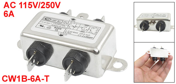 Product Name AC Power Line EMI Filter Model No. CW1B-6A-T Working Voltage AC 115V/250V, 50/60Hz Rated Current 6A Working Temperature 40C Installing Hole Size(Approx) Distance: 55mm / 2.2"
