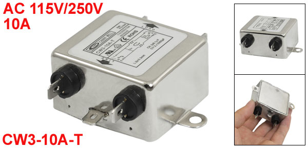 Product Name AC Power Line EMI Filter Model No. CW3-10A-T Working Voltage AC 115V/250V, 50/60Hz Rated Current 10A Working Temperature 40C Installing Hole Size(Approx) Distance: 63mm / 2.5"