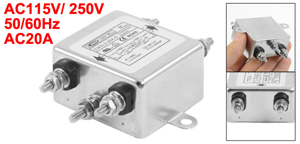 Product Name AC Power Line EMI Filter Model No. CW3L2-20A-S Working Voltage AC115V/ 250V, 50/60Hz Rated Current AC 20A Working Temperature 40C Installing Hole Size(Approx) Distance: 63mm / 2.5"