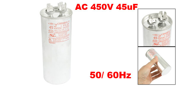 Product Name Motor Capacitor Material Polypropylene Model CBB65A-1 Capacitance 45uF Rated Voltage AC 450V Tolerance ±5% Frequency 50/ 60Hz Operating Temperature 40/70/21 Body Dimension 12.5 x 5cm/ 4.9" x 1.9"(H*D) Total Length 13.8cm/ 5.4" Color Silver Tone Weight 248g Package Content 1 x Motor Capacitor - Reviews