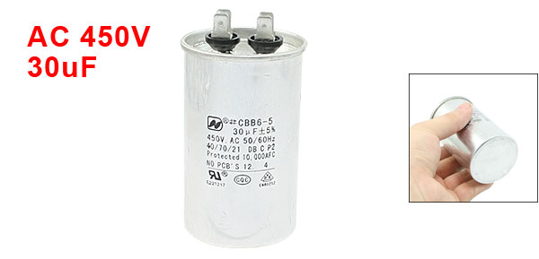 Product Name Motor Capacitor Housing Material Metal Dielectric Material Metallized Polypropylene Film Model CBB6-5 Capacitance 30uF Tolerance ±5% Rated Voltage AC 450V Frequency 50/60Hz Operating Temperature 40/70/21 Body Size 5.5 x 9.5cm/2.2" x 3.74"(D * H) Color Silver Tone Net Weight 178g Package Content 1 x Motor Capacitor - Reviews