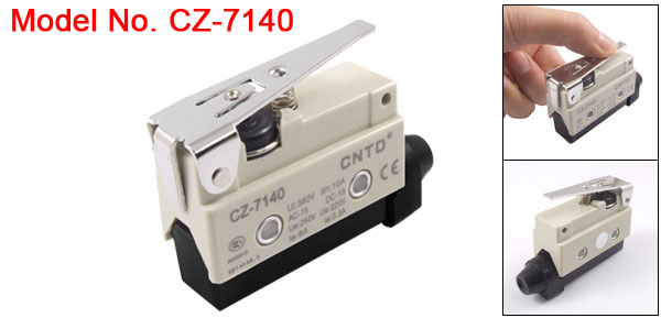 Product Name Limit Switch Model No. CZ-7140 Actuator Action Momentary Actuator Type Short Straight Hinge Lever Contact Type 1 NO, 1 NC, 1 Com(SPDT) Terminal Type Screw Terminals Ui 380V Ith 10A AC-15 Ue: 250V, le: 6A DC-13 Ue: 220V, le: 0.3A Lever Size 5.4 x 0.65cm / 3.1" x 0.25"(L*Tip W) Hole Dia 0.42cm / 0.165" Main Body Size 5.44 x 2.17 x 3.75cm / 2.1" x 0.85" x 1.5"(L*W*H) Overall Height 4.93cm / 1.94" Material Metal, Plastic Color As Picture Show Net Weight 53g Package Content 1 x Limit Switch - Reviews