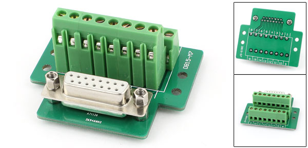 Product Name DB15 Adapter Tyle DB15 2 Row 15pin Jack to 8 Positions Screw Terminals Design Screw Type Screw Dia 2mm/0.08" Total Size 60 x 50 x 28mm/2.4" x 2" x 1.1"(L*W*H) Material Metal, Electric Part Color Green, Silver Tone Weight 45g Package Content 1 x DB15 Adapter - Reviews