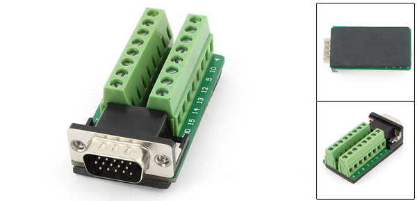 Product Name DB15 Adapter Tyle DB15 15pin Plug to Two Row 8 Positions Screw Terminals Design Riveting Tooth Riveting Tooth Dia 2mm/0.08" Total Size 63 x 30 x 20mm/2.5" x 1.2" x 0.8"(L*W*H) Material Metal, Electric Part Color Black, Green, Silver Tone Weight 35g Package Content 1 x DB15 Adapter - Reviews