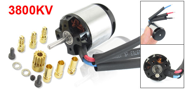 DetailsD2835 3800KV Outrunner Brushless Motor for RC Glider Helicopter Aircraft  Product Name Brushless Motor Model D2835 KV 3800RPM/V Fit for Battery 2-4S Li-Poly Shaft Size 3.17 x 15mm/ 0.1" x 0.6"(D*L) Motor Part Size 32 x 28mm/ 1.3" x 1.1"(L*D) Mounted Screw Hole Diameter 2.5mm/0.1" 2.2mm/0.09" Cable Length 55mm / 2.2" Material Metal, Electronic Parts Color Silver Tone, Black Weight 70g Package Content 1 x Brushless Motor 1 x 3.17mm 13T Gear 2 x Motor Screw 2 x Gasket 3 x Banana Plug(Male & Female) 3 x Heat Shrinkable Tube