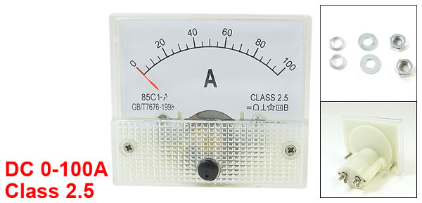 Product Name Analog Ammeter Model 85C1-A Measuring Current Range DC 0-100A Accuracy Class 2.5 Meter Panel Size(Approx) 6.4 x 5.6 x 1.1cm / 2.5" x 2.2" x 0.43"(L*W*T) Thread Size Longer One: 0.4 x 1.2cm / 0.16" x 0.47"(D*L)