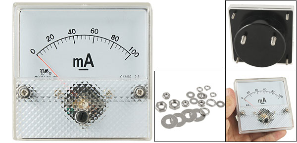 DC Current Panel Meter Model No. YS-80 Scale Range DC 0~100mA Accuracy Class 2.5 Back Screw Diameter 5mm/ 0.2" & 3mm/ 0.12" Back Round Base Dia. 64mm/ 2.5" Panel Size 8 x 8 x 1.3cm/ 3.1" x 3.1" x 0.5" (L*W*T) Overall Depth 4.8cm/ 1.9" Color White & Black Main Material Plastic & Metal Net Weight 102g Package 1 x DC Current Panel Meter - Reviews