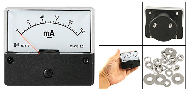 Product Name Analog Ammeter Measuring Current Range DC 0 - 100mA Accuracy Class 2.5 Meter Face Size(Approx) 7 x 6cm/ 2.7" x 2.3" (L*W) Thread Size 0.28 x 0.75cm / 0.11" x 0.30" (D*L) 0.38 x 0.8cm / 0.15" x 0.3" (D*L) Overall Depth 4.3cm/ 1.7" Color White, Black Net Weight 68g Package Content 1 x Analog Ammeter Fitting Part - Reviews