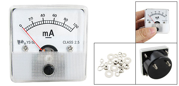 Product Name Analog Ammeter Model YS-50 Measuring Current Range DC 0-100mA Accuracy Class 2.5 Meter Face Size(Approx) 5 x 5 x 1cm / 1.9" x 1.9" x 0.39"(L * W * T) Thread Size 0.3 x 0.9mm / 0.11" x 0.35"(D * L) 0.2 x 0.9cm / 0.07" x 0.35"(D * L) Overall Depth 3.3cm / 1.3" Color White, Black Net Weight 58g Package Content 1 x Analog Ammeter Several Installing Parts - Reviews