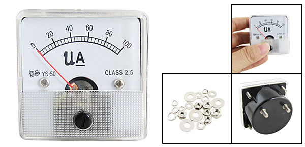 Product Name Analog Ammeter Model YS-50 Measuring Current Range DC 0-100uA Accuracy Class 2.5 Meter Face Size(Approx) 5 x 5 x 1cm / 1.9" x 1.9" x 0.39"(L * W * T) Thread Size 0.3 x 0.9mm / 0.11" x 0.35"(D * L) 0.2 x 0.9cm / 0.07" x 0.35"(D * L) Overall Depth 3.3cm / 1.3" Color White, Black Net Weight 58g Package Content 1 x Analog Ammeter Several Installing Parts - Reviews