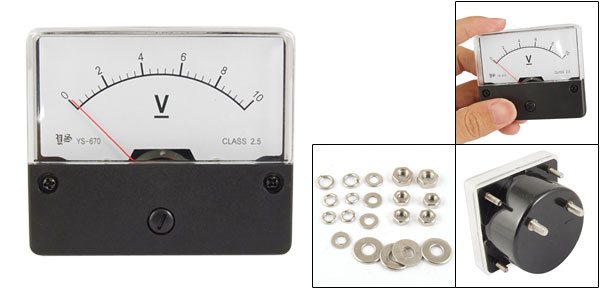 Product Name Analog Voltmeter Model YS-670 Measuring Voltage Range DC 0-10V Accuracy Class 2.5 Meter Face Size(Approx) 7 x 6.1 x 1.2cm/ 2.7" x 2.4" x 0.5"(L*W*T) Thread Size 0.4 x 1cm / 0.15" x 0.4"(D*L) 0.27 x 0.9cm/ 0.11" x 0.35"(D*L) Overall Depth 3.5cm/ 1.4" Color Black, White Net Weight 72g Package Content 1 x Analog Voltmeter Several Installing Parts - Reviews