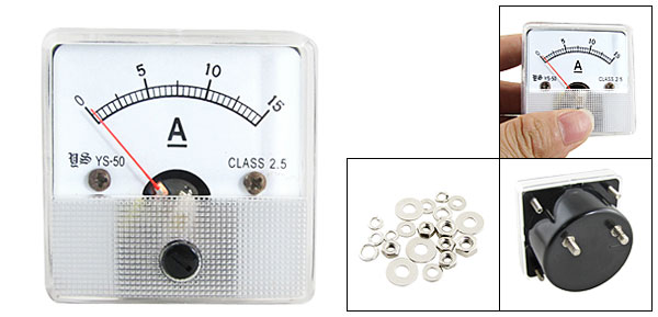 Product Name Analog Ammeter Model YS-50 Measuring Current Range DC 0-15A Accuracy Class 2.5 Meter Face Size(Approx) 5 x 5 x 1cm / 1.9" x 1.9" x 0.39"(L * W * T) Thread Size 0.3 x 0.9mm / 0.11" x 0.35"(D * L) 0.2 x 0.9cm / 0.07" x 0.35"(D * L) Overall Depth 3.3cm / 1.3" Color White, Black Net Weight 58g Package Content 1 x Analog Ammeter Several Installing Parts - Reviews
