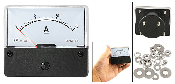 Product Name Analog Ammeter Measuring Current Range DC 0 - 15A Accuracy Class 2.5 Meter Face Size(Approx) 7 x 6cm/ 2.7" x 2.3" (L*W) Thread Size 0.28 x 0.75cm / 0.11" x 0.30" (D*L) 0.38 x 0.8cm / 0.15" x 0.3" (D*L) Overall Depth 4.3cm/ 1.7" Color White, Black Net Weight 69g Package Content 1 x Analog Ammeter Fitting Part - Reviews