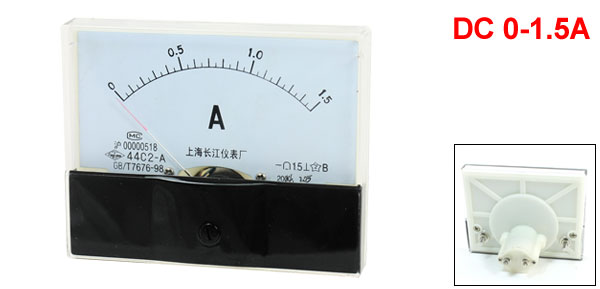 Product Name Analog Ammeter Model 44C2-A Measuring Current Range DC 0-1.5A Accuracy 1.5 Panel Size(Approx) 100 x 80 x 13mm/4" x 3.1" x 0.51"(L*W*T) Thread Size Big One: 4 x 6mm / 0.16" x 0.24"(D*L)