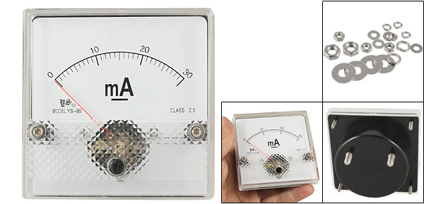 DC Current Panel Meter Model No. YS-80 Scale Range DC 0~30mA Accuracy Class 2.5 Back Screw Diameter 5mm/ 0.2" & 3mm/ 0.12" Back Round Base Dia. 64mm/ 2.5" Panel Size 8 x 8 x 1.3cm/ 3.1" x 3.1" x 0.5" (L*W*T) Overall Depth 4.8cm/ 1.9" Color White & Black Main Material Plastic & Metal Net Weight 106g Package 1 x DC Current Panel Meter - Reviews