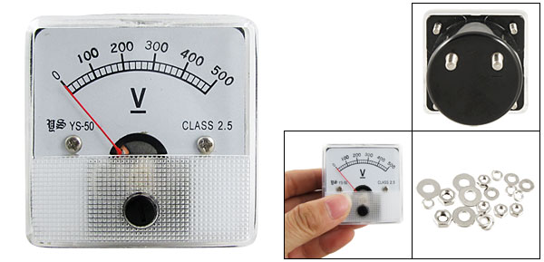 Product Name Analog Voltmeter Model YS-50 Measuring Voltage Range DC 0-500V Accuracy Class 2.5 Meter Face Size(Approx) 5 x 5 x 1cm / 1.9" x 1.9" x 0.39"(L * W * T) Thread Size 0.3 x 0.9mm / 0.11" x 0.35"(D * L) 0.2 x 0.9cm / 0.07" x 0.35"(D * L) Overall Depth 3.3cm / 1.3" Color White, Black Net Weight 58g Package Content 1 x Analog Voltmeter Several Installing Parts - Reviews