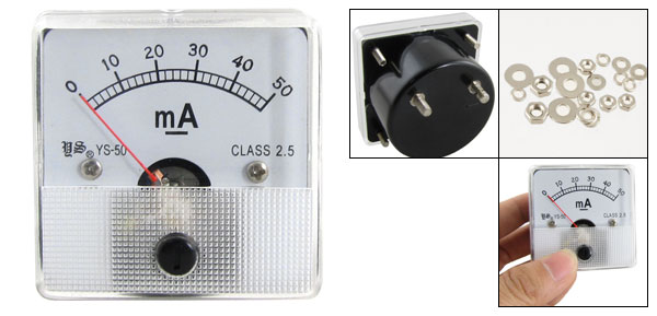 Product Name Analog Ammeter Model YS-50 Measuring Current Range DC 0-50mA Accuracy Class 2.5 Meter Face Size(Approx) 5 x 5 x 1cm / 1.9" x 1.9" x 0.39"(L * W * T) Thread Size 0.3 x 0.9mm / 0.11" x 0.35"(D * L) 0.2 x 0.9cm / 0.07" x 0.35"(D * L) Overall Depth 3.3cm / 1.3" Color White, Black Net Weight 58g Package Content 1 x Analog Ammeter Several Installing Parts - Reviews